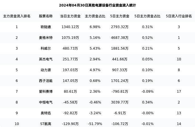 从主力资金流向来看,其他电源设备行业今日主力资金流入12.06亿元,在所有申万二级行业中排名:9/131。