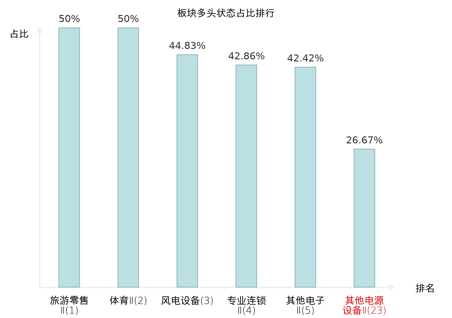全市场所有行业板块中主力多头状态占比排名中,旅游零售Ⅱ板块位居第一。化妆品板块名次提升最快,较昨日上升66位。