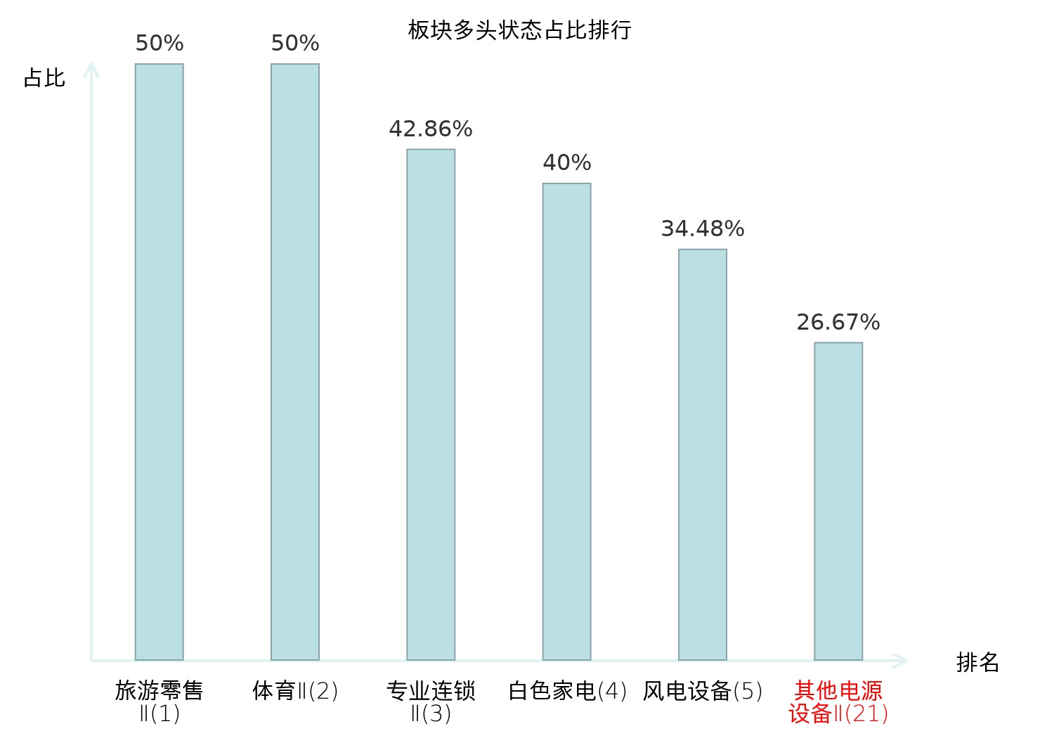 全市场所有行业板块中主力多头状态占比排名中,旅游零售Ⅱ板块位居第一。能源金属板块名次提升最快,较昨日上升50位。