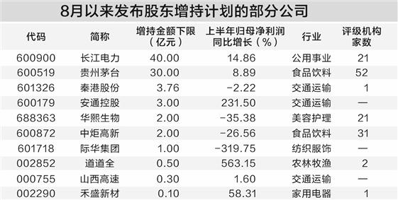 据证券时报·数据宝统计,8月以来,共有19家上市公司发布股东增持计划(剔除一致行动人内部转让),包括多家行业龙头公司。