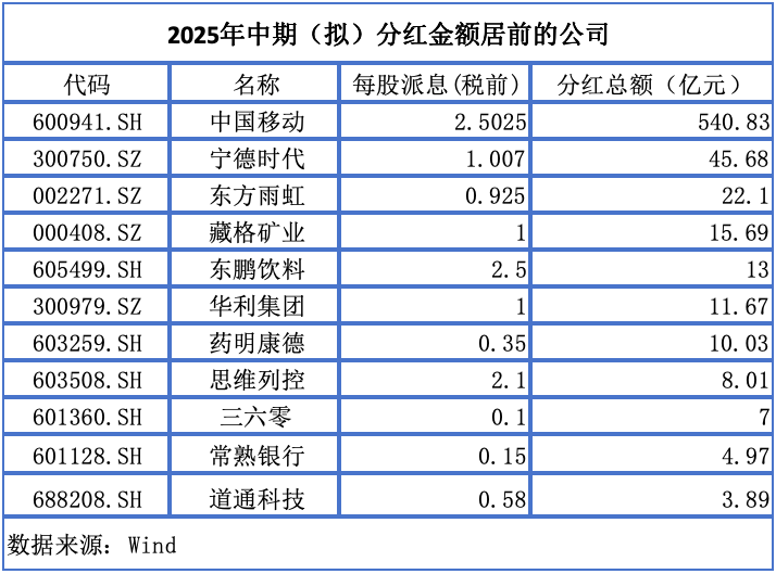 中期分红金额紧随其后的,是一批行业龙头公司。宁德时代、东方雨虹、藏格矿业(000408.SZ)分别拟“10派10.07元”“10派9.25元”和“10派10元”,拟派现总额将达到45.68亿元、22.1亿元和15.69亿元。