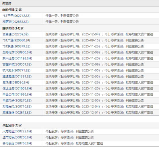 上证报中国证券网讯 12月9日,2家公司临停:*ST三圣、皮阿诺,3家公司复牌:太龙药业、退市苏吴、普冉股份。
