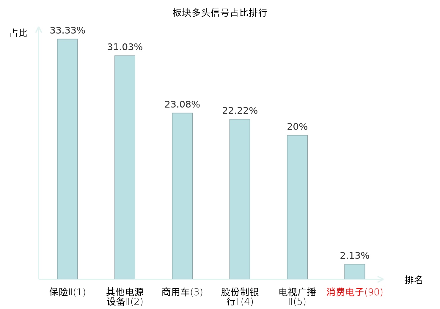 全市场所有行业板块中主力多头信号占比排名中,保险Ⅱ板块位居第一。股份制银行Ⅱ板块名次提升最快,较昨日上升119位。