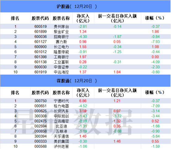 沪深股通两市前十大成交中净卖出个股略多。买入方面,宁德时代净买入居首,长安汽车连续获北向资金净买入。