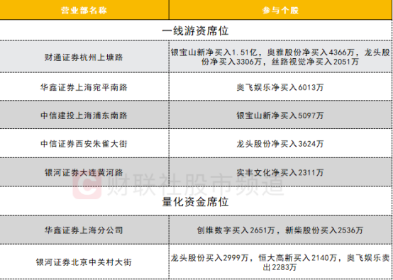 一线游资活跃度一般,龙头股份今日反包涨停获两家一线游资席位买入,该股昨日跌停遭四家一线游资席位卖出。高位股银宝山新获财通证券杭州上塘路买入1.51亿,跌停的奥飞娱乐获华鑫证券上海宛平南路买入超6000万。