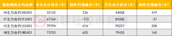 四大期指主力合约中,IH合约多空双方均加仓,空头加仓数量略多;IF合约多空双方均减仓,多头减仓数量较多;IC合约多空双方均加仓,多头加仓数量较多;IM合约多空双方均加成,多头加仓数量较多。