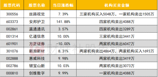 卖出方面,多只消费电子概念股遭机构卖出,其中瀛通通讯、亿道信息、惠威科技均遭机构卖出超3000万。券商股方正证券遭机构卖出超6000万。
