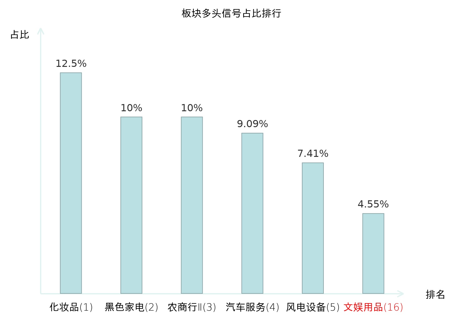 全市场所有行业板块中主力多头信号占比排名中,化妆品板块位居第一。黑色家电板块名次提升最快,较昨日上升111位。