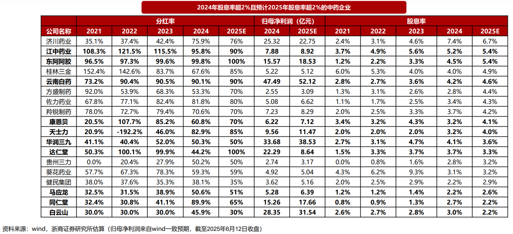 高分红提供持续稳定的股东回报。高分红、稳增长、高股息,中药央国企红利价值凸显。2024年股息率超2%且预计2025年股息率超2%的中药企业,其中超半数为央国企,中药央国企中江中药业、东阿阿胶股息率靠前,值得注意的是天士力2024年加大了分红力度,全年3次分红,股息支付率达82.86%。