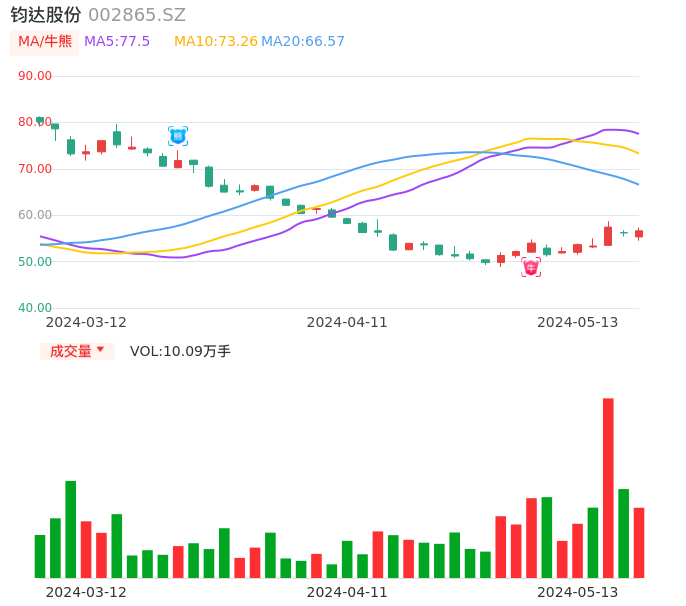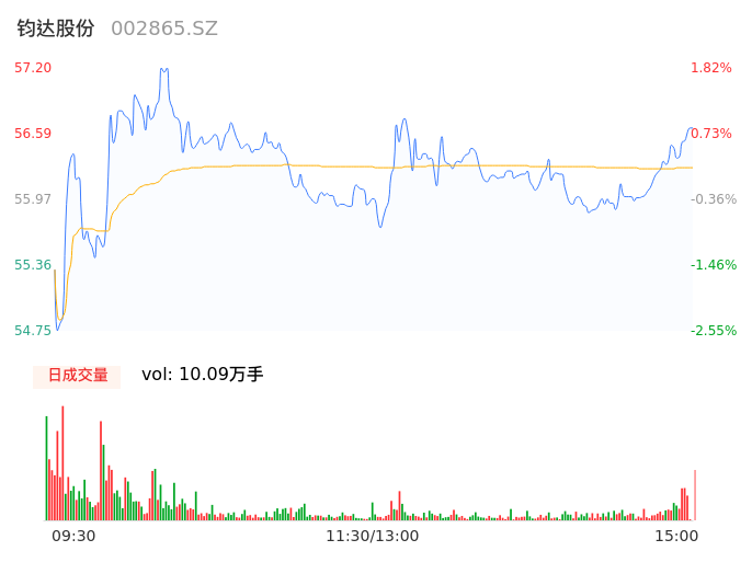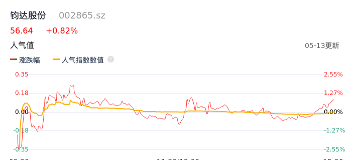 05月13日,钧达股份收报56.64,股价涨幅0.82%,成交金额5.68亿元,换手率4.51%。