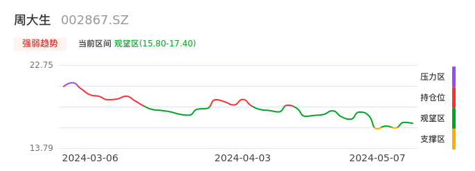 我们来看一下该股的九方特色指标强弱趋势的情况:周大生近日从支撑区回到观望区。股价经过前期快速下跌后目前跌势有所放缓。现在下跌动能有重新放大迹象,反弹行情可能临近尾声。建议继续谨慎观望。