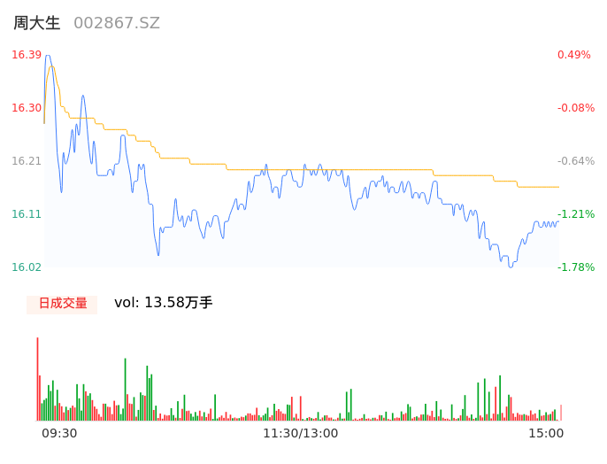 05月07日,周大生收报16.10,股价涨幅-1.29%,成交金额2.19亿元,换手率1.25%。
