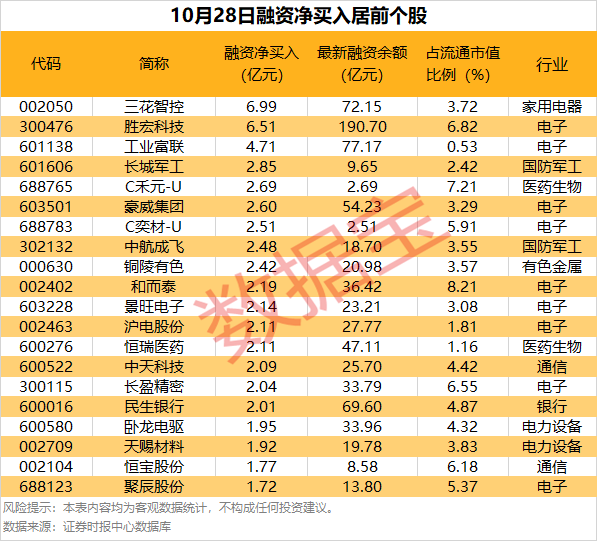 具体到个股,10月28日获融资净买入1亿元以上的有45只,其中,16股获融资净买入额超2亿元。三花智控融资净买入额居首,当日净买入6.99亿元,其次是胜宏科技、工业富联,融资净买入金额分别为6.51亿元、4.71亿元,融资净买入金额居前的还有长城军工、C禾元-U、豪威集团、C奕材-U等。