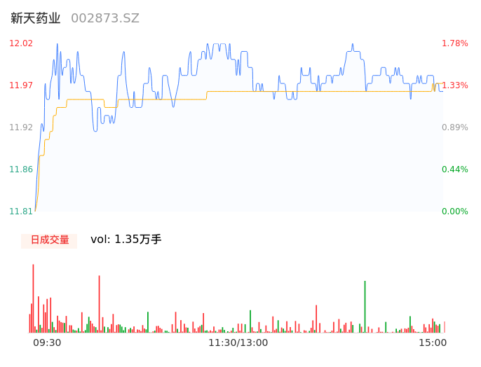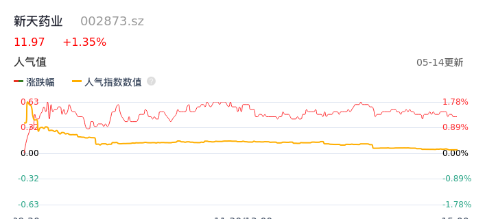 05月14日,新天药业收报11.97,股价涨幅1.35%,成交金额1613.05万元,换手率0.60%。