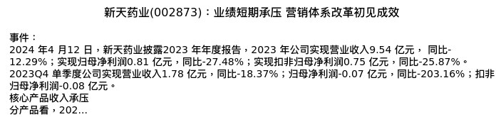 值得注意的是:2024年04月天风证券的杨松分析师,首次发布关于新天药业的研究报告,标题为:新天药业(002873):业绩短期承压 营销体系改革初见成效。
