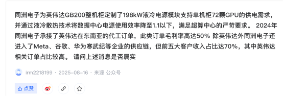 8月18日,有投资者在互动易向公司提问称,“除了英伟达之外,同洲电子还进入了Meta、谷歌、华为、寒武纪等企业的供应链,但前五大客户收入占比达70%,其中英伟达相关订单占比较高”,该消息是否属实。