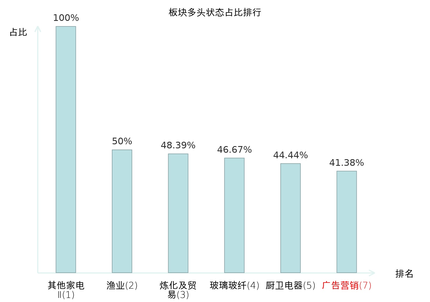 全市场所有行业板块中主力多头状态占比排名中,其他家电Ⅱ板块位居第一。冶钢原料板块名次提升最快,较昨日上升67位。