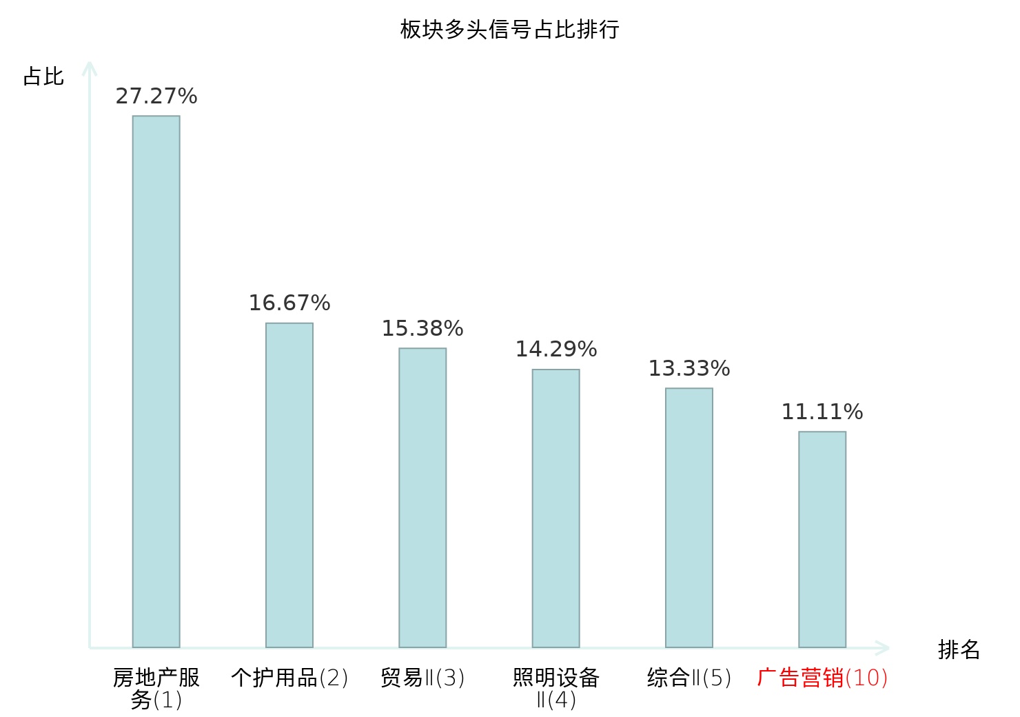 全市场所有行业板块中主力多头信号占比排名中,房地产服务板块位居第一。房地产服务板块名次提升最快,较昨日上升116位。