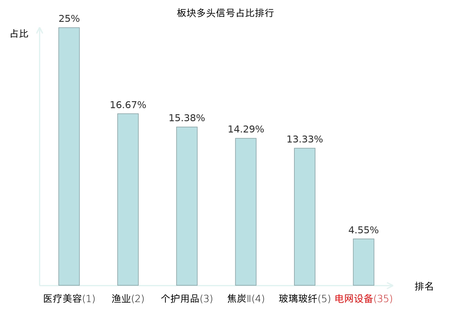 全市场所有行业板块中主力多头信号占比排名中,医疗美容板块位居第一。医疗美容板块名次提升最快,较昨日上升126位。