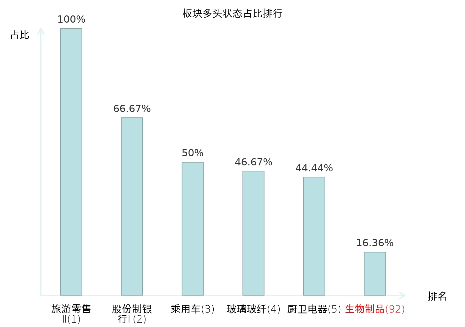 全市场所有行业板块中主力多头状态占比排名中,旅游零售Ⅱ板块位居第一。农产品加工板块名次提升最快,较昨日上升72位。