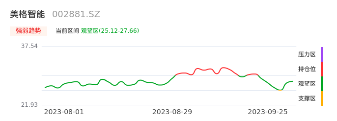 我们来看一下该股的九方特色指标强弱趋势的情况:美格智能自09月18日从持仓区下穿到观望区。股价近期持续下跌后,短期出现止跌迹象。后续重点关注能否再次站上多空分界点:27.66元。如未能有效突破则可能进入新一轮空头行情。