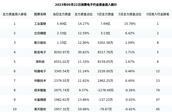 从主力资金流向来看,消费电子行业今日主力资金流入73.86亿元,在所有申万二级行业中排名:112/131。