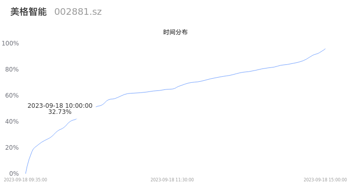 首先我们来看当日成交的时间分布。将今日交易时间按照5分钟的时间间隔进行切片,并绘制分布直方图进行观察。可以发现,10点之前的成交量占全天成交量的32.73%,这说明,该股票活跃时段换手火爆,资金热情高涨。