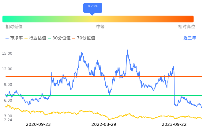2023年09月22日,美格智能上涨4.46%收于26.46,今日成交金额1.57亿元。下文将从市盈率PETTM、市净率PB、市现率3个角度去分析公司估值情况。