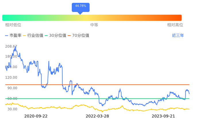 美格智能当前市盈率PETTM为73.36,在所属的消费电子中,市盈率PETTM排58名。前5名分别为环旭电子PETTM11.34、领益智造PETTM16.49、视源股份PETTM16.96、蓝思科技PETTM17.64、华勤技术PETTM17.73。从PETTM估值走势数据来看,美格智能当前市盈率PETTM为73.36,超过近3年44.78%的历史数据。