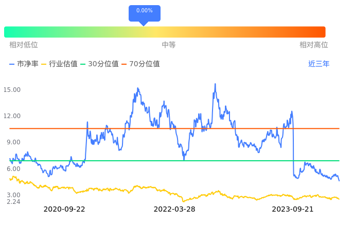美格智能当前市净率PB为4.59,在所属的消费电子中,市净率PB排82,前五名分别为科森科技市净率1.26、蓝思科技市净率1.33、达瑞电子市净率1.34、奥尼电子市净率1.41、春秋电子市净率1.47。美格智能当前市净率PB为4.58,超过近3年0.00%的历史数据。
