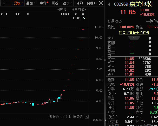 嘉美包装(002969)早盘再次涨停,盘中涨停板封单超过80万手。该股自12月17日以来连续录得10个涨停板,最新股价创近5年新高,A股市值达到110亿元以上。公司近期股价持续大涨,与一则股权转让公告密切相关。