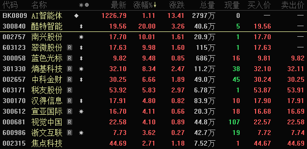 今日早盘,AI智能体相关概念股走强,其中酷特智能“20cm”涨停,南兴股份、翠微股份涨停,熵基科技、蓝色光标、中科金财等大幅上涨。