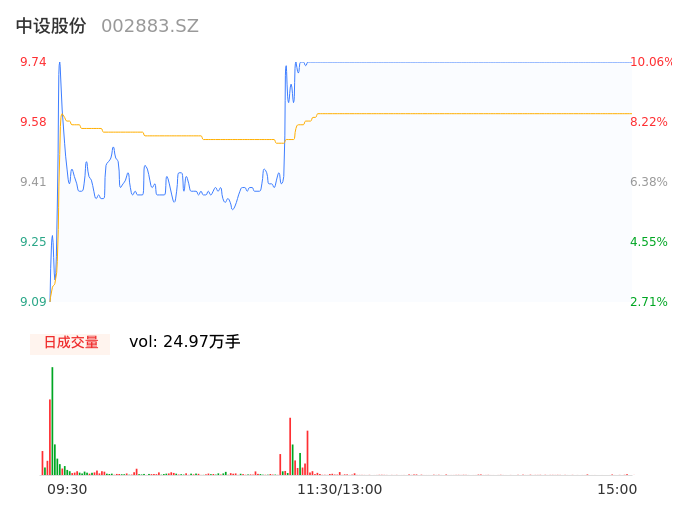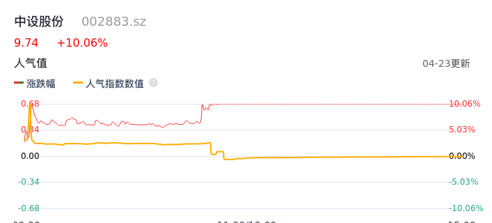 04月23日,中设股份收报9.74,股价涨幅10.06%,成交金额2.40亿元,换手率18.43%。