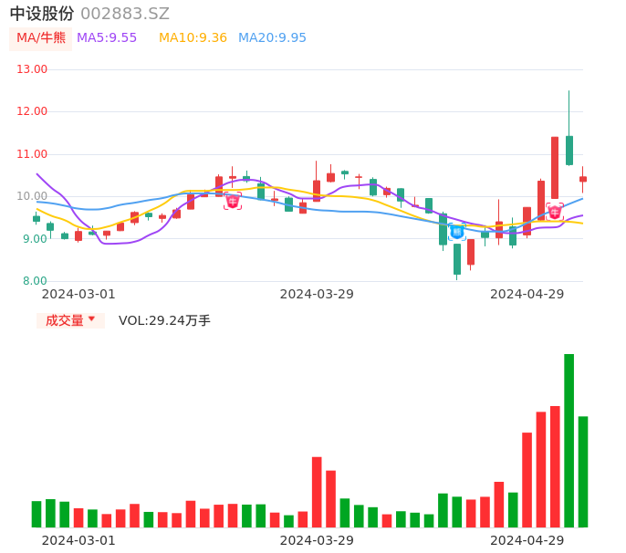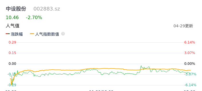 04月29日,中设股份收报10.46,股价涨幅-2.70%,成交金额3.05亿元,换手率21.58%。