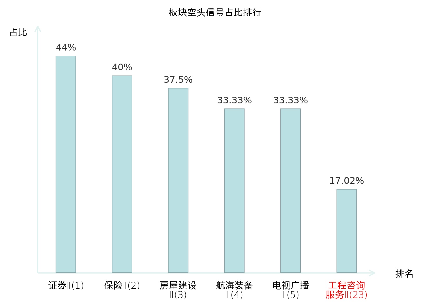 全市场所有行业板块中主力空头信号占比排名中,证券Ⅱ板块位居第一。证券Ⅱ板块名次提升最快,较昨日上升125位。