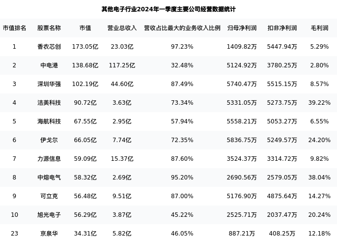 京泉华最新报告期数据为一季度,下表汇总了其他电子行业内市值靠前的公司一季度主要经营数据