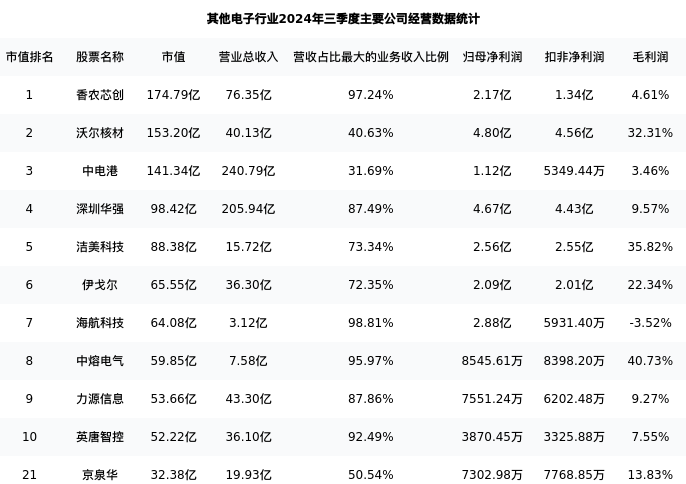京泉华最新报告期数据为三季度,下表汇总了其他电子行业内市值靠前的公司三季度主要经营数据
