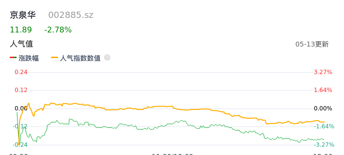 05月13日,京泉华收报11.89,股价涨幅-2.78%,成交金额4087.22万元,换手率1.47%。