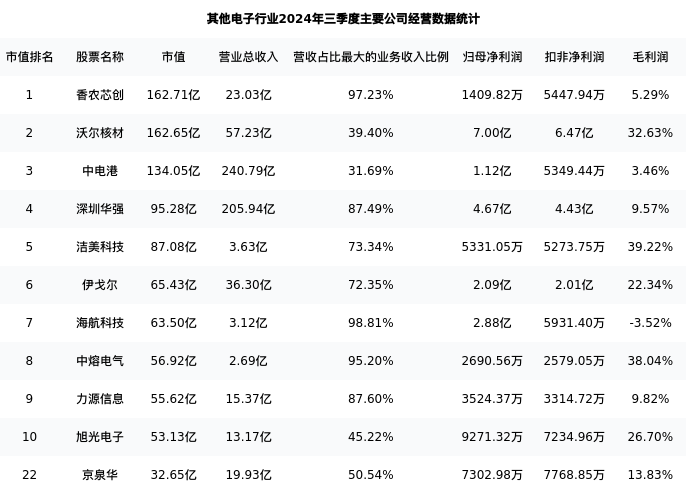 京泉华最新报告期数据为三季度,下表汇总了其他电子行业内市值靠前的公司三季度主要经营数据