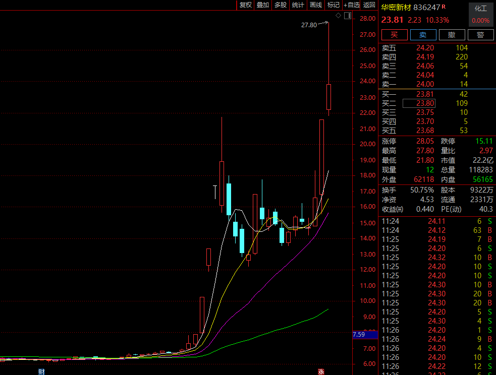 华密新材在昨日30%涨停的基础上,今日盘中一度再次冲击涨停,创历史新高,近1个月来5度涨停,累计大涨逾316%;中欣氟材开盘一字涨,连续第3日封板;新瀚新材连续2个20%涨停之后,今日盘中也一度再次冲击涨停,股价创历史新高(复权)。