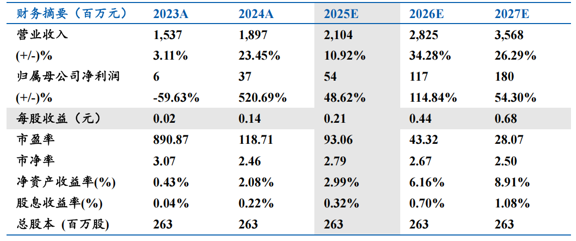预计公司2025-2027年实现营收21.0、28.3、35.7亿元(此前25.5、36.7亿元,新增35.7亿元),2025-2027年归母净利润0.5、1.2、1.8亿元(此前1.0、1.8亿元,新增1.8亿元),对应2025-2027年PE为93/43/28X。维持“增持”评级。