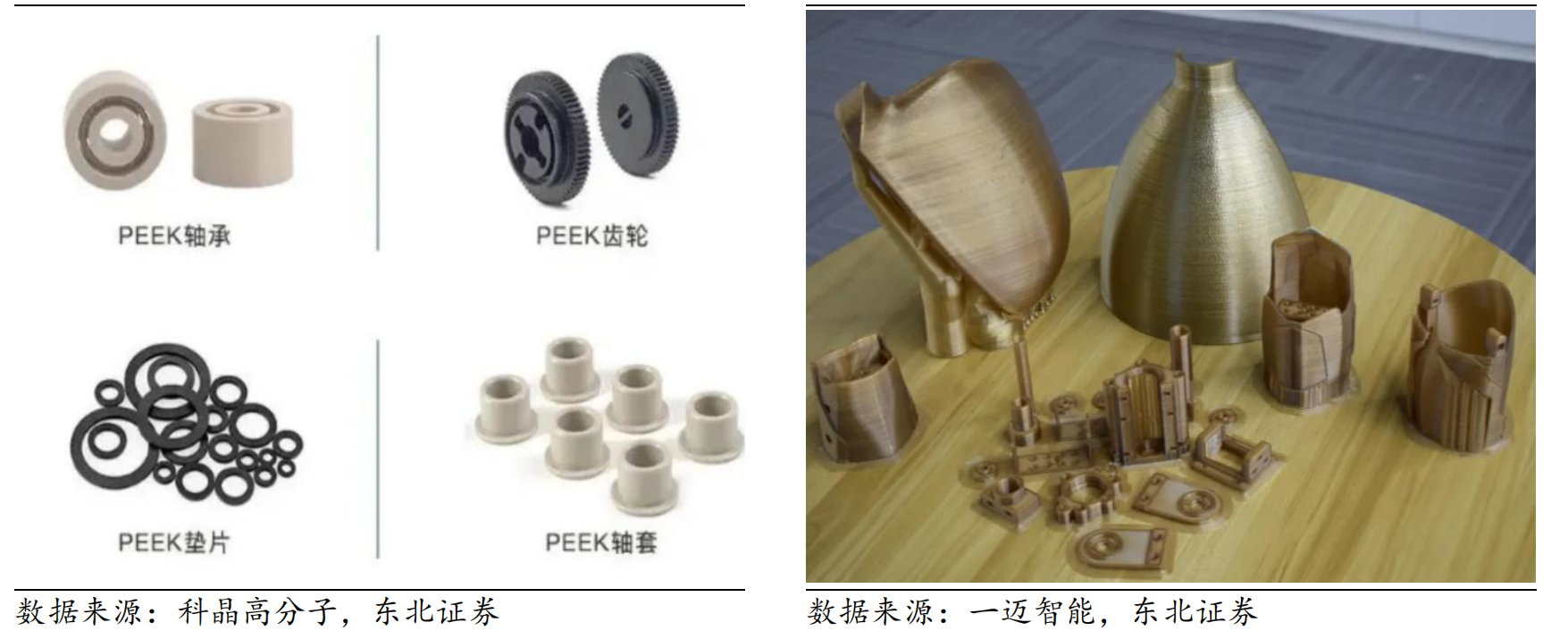 图表7:PEEK在汽车零件上的应用样品图(左)3D打印PEEK材料机器人部件样品图(右)