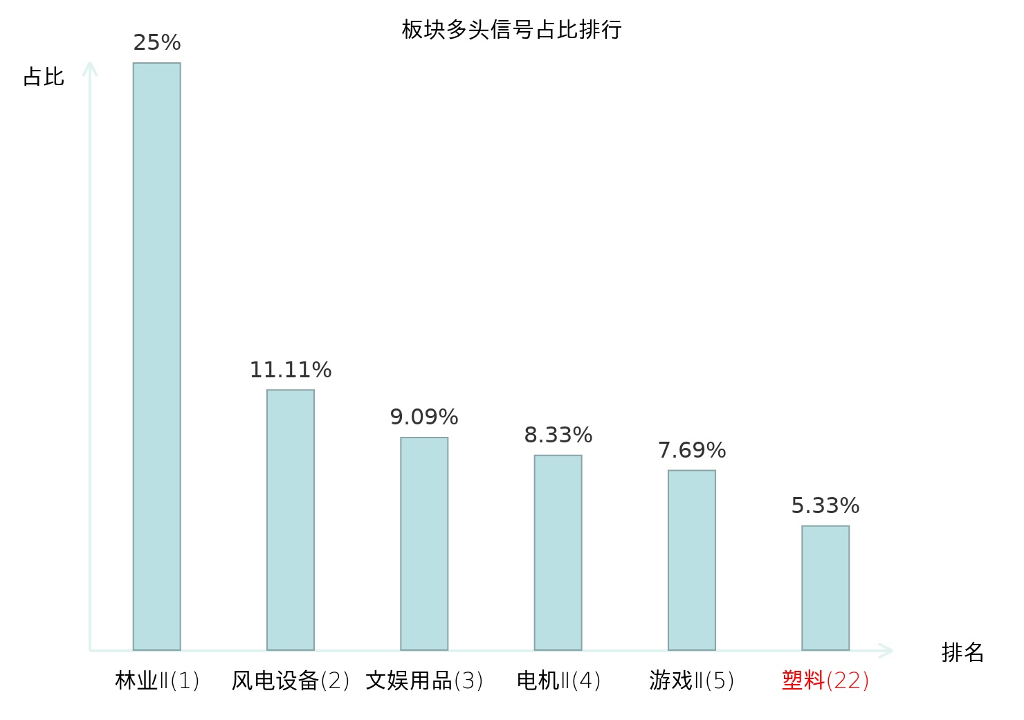 全市场所有行业板块中主力多头信号占比排名中,林业Ⅱ板块位居第一。林业Ⅱ板块名次提升最快,较昨日上升124位。