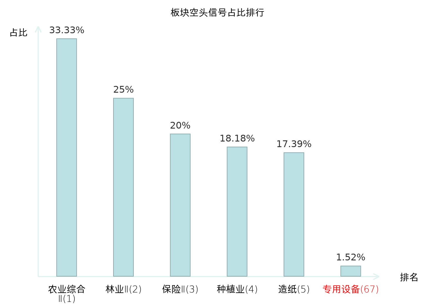 全市场所有行业板块中主力空头信号占比排名中,农业综合Ⅱ板块位居第一。炼化及贸易板块名次提升最快,较昨日上升115位。
