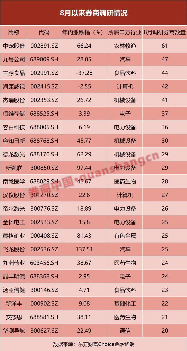 从本月券商调研的上市公司来看,人气最高的是中宠股份(002891.SZ),该公司股票今年以来上涨66%;九号公司(689009.SH)、甘源食品(002991.SZ)、海康威视(002415.SZ)、杰瑞股份(002353.SZ)也均被超40家券商扎堆调研。