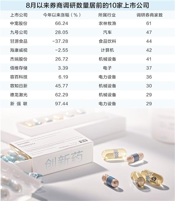 从8月券商调研的上市公司来看,人气最高的是中宠股份,该公司股票今年以来上涨66%;九号公司、甘源食品海康威视杰瑞股份也均被超40家券商扎堆调研。