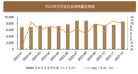 需求端来看,去年全社会电量达92241亿千瓦时,同比增长6.7%,其中自9月以来,连续四月用电量同比增速超9%,反映我国经济复苏良好态势,2024年用电量或将进一步增长。