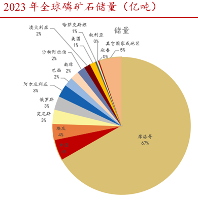 中国磷矿石储量全球第二,但资源量显著低于摩洛哥。根据USGS,全球磷矿资源多集中于非洲、美洲和亚洲。其中,摩洛哥是全球第一大磷矿石储量国,2023年储量约500亿吨(全球占比高达67.6%)。中国磷矿石储量常年位居全球第二,但整体资源量远低于摩洛哥。国内储量约37亿吨(全球占比仅5.1%)。