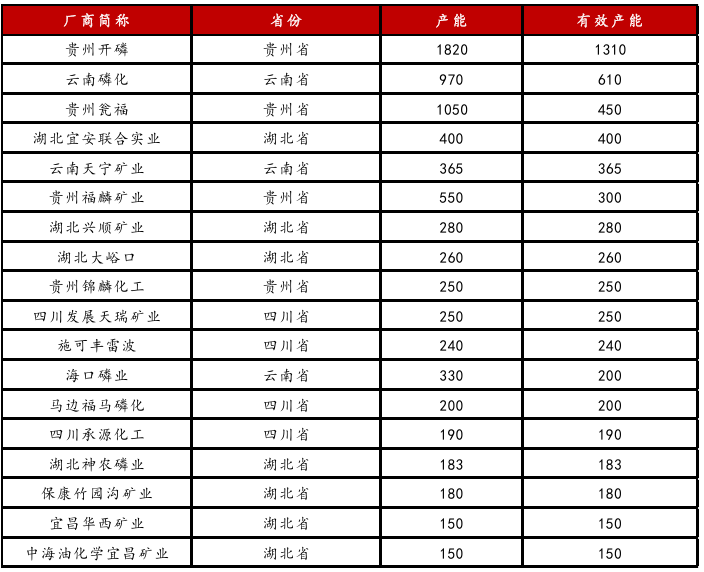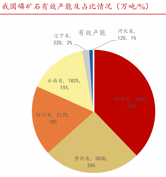 我国磷矿分布集中,四省占据主要产能,云贵川和湖北四省。截至2024年8月,国内磷矿石有效产能合计11916万吨/年。鄂、黔、川、滇为国内磷矿资源富集地,分地区产能分别为4481、3030、2175、1825万吨/年,占比分别为37.6%/25.4%/18.3%/15.3%,CR4高达96.6%。形成以湖北宜昌、荆襄、保康,贵州开阳、瓮福,四川马边-雷波、德阳,云南滇中八大磷矿生产基地。分企业看,截至2024年8月,贵州开磷、云南磷化(云天化)、贵州瓮福、湖北宜安联合实业和云南天宁矿业(云天化)是国内前五大磷矿生产企业,国内市占率约11.0%、5.1%、3.8%、3.4%和3.1%。可以看到我国的磷矿石行业格局是较为分散的,头部企业市场份额还有提升空间。