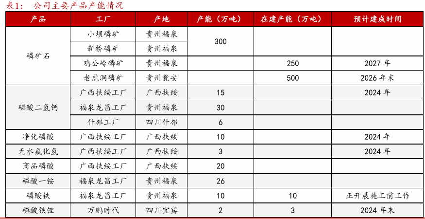 公司磷化工上下游一体深度布局。公司拥有小坝磷矿、新桥磷矿及鸡公岭磷矿,参股公司天一矿业拥有老虎洞磷矿,2024年公司收购黔源地勘58.5%的股权,黔源地勘拥有老寨子磷矿的采矿权。2024年公司具有300万吨/年的磷矿石生产能力,福麟矿业实现磷矿石开采总量314.84万吨,外销磷矿石67.93万吨。